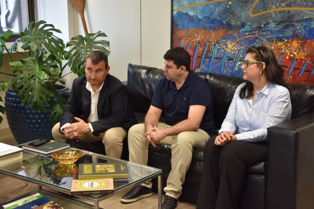 Ramón Figueroa esteve acompanhado do coordenador de relações institucionais e de ESG da Arauco no Brasil, Márcio Couto, e a especialista em relações institucionais e responsabilidade social da Arauco no Brasil, Tatiane Palazzio. Eles também visitaram as instalações da Escola Sesi de Campo Grande.