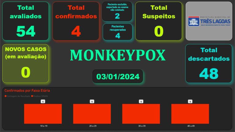 BOLETIM MONKEYPOX – 03 de janeiro de 2024 Por Redação 14:21 - 04/01/2024 0 478 Share FacebookTwitterPinterestWhatsApp Foto: Divulgação/Prefeitura de Três Lagoas A Prefeitura de Três Lagoas, por meio do setor de Vigilância Epidemiológica da Secretaria Municipal de Saúde (SMS), divulga o Boletim Monkeypox. Share FacebookTwitterPinterestWhatsApp Leia também Suzano esclarece informações sobre suposta condenação judicial 19:22 - 16/02/2026 Corpo é encontrado em área de mata no Parque das Nações Indígenas 17:11 - 16/02/2026 Suzano bate recorde de vendas em 2025 e receita líquida ultrapassa R$ 50,1 bilhões 16:40 - 16/02/2026 TJMS pode derrubar pagamento milionário de adicional a servidores 14:49 - 16/02/2026 Ofensiva destrói roças de maconha que renderiam US$ 25 milhões ao tráfico 11:54 - 16/02/2026 Jovem de 22 anos morre após ser baleado durante briga em bar na fronteira 10:04 - 16/02/2026 Entre cores, música e fé: encontro de jovens propõe viver a alegria do Carnaval na presença de Jesus 09:11 - 16/02/2026 No dia do aniversário, jovem morre ao ter moto atingida por carro em MS 08:16 - 16/02/2026 Abono salarial começa a ser pago nesta segunda (16) 08:09 - 16/02/2026 Últimas Perfil Celulose Suzano esclarece informações sobre suposta condenação judicial 19:22 - 16/02/2026 Polícia Corpo é encontrado em área de mata no Parque das Nações Indígenas 17:11 - 16/02/2026 Perfil Celulose Suzano bate recorde de vendas em 2025 e receita líquida ultrapassa R$ 50,1 bilhões 16:40 - 16/02/2026 Estado TJMS pode derrubar pagamento milionário de adicional a servidores 14:49 - 16/02/2026 Polícia Ofensiva destrói roças de maconha que renderiam US$ 25 milhões ao tráfico 11:54 - 16/02/2026