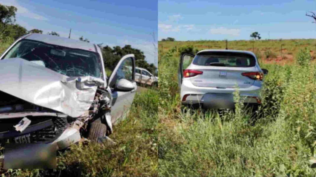 A força do impacto foi tamanha que um dos carros teve as rodas dianteiras lançadas no matagal enquanto as traseiras ficaram no acostamento. A lataria da região traseira lateral ficou totalmente destruída.