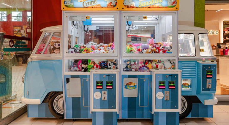A máquina de ursinhos de pelúcia foi danificada durante a tentativa de furto. O cadeado e o dispositivo de nota (noteira) foram quebrados.