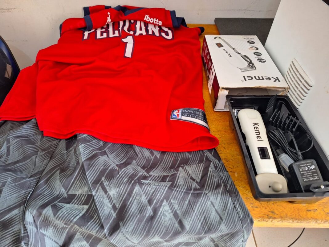 Durante a ação, os policiais encontraram com o acusado uma bermuda, uma camiseta e uma máquina de cortar cabelo ainda com o sensor de objeto e etiqueta de identificação da loja.