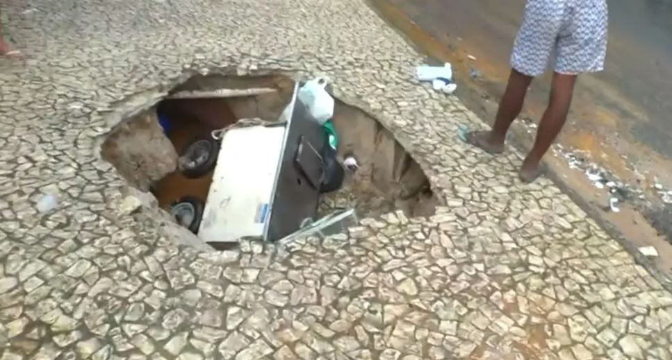De acordo com informações preliminares, o desabamento da calçada causou a queda de um carrinho de venda de lanches na cratera formada.