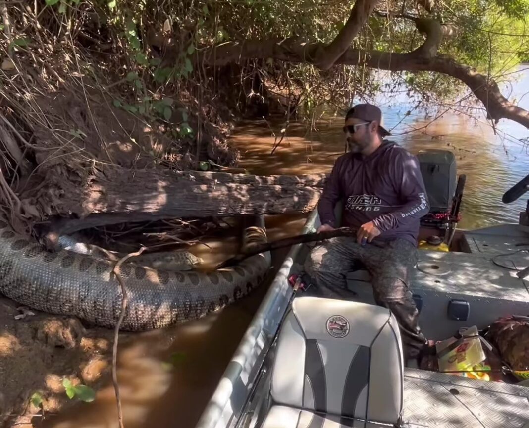 Uma cena lamentável chamou a atenção de pescadores e internautas na tarde da última terça-feira (23). Uma sucuri gigante foi encontrada morta no Rio Dourados, próximo ao Porto Vilma.