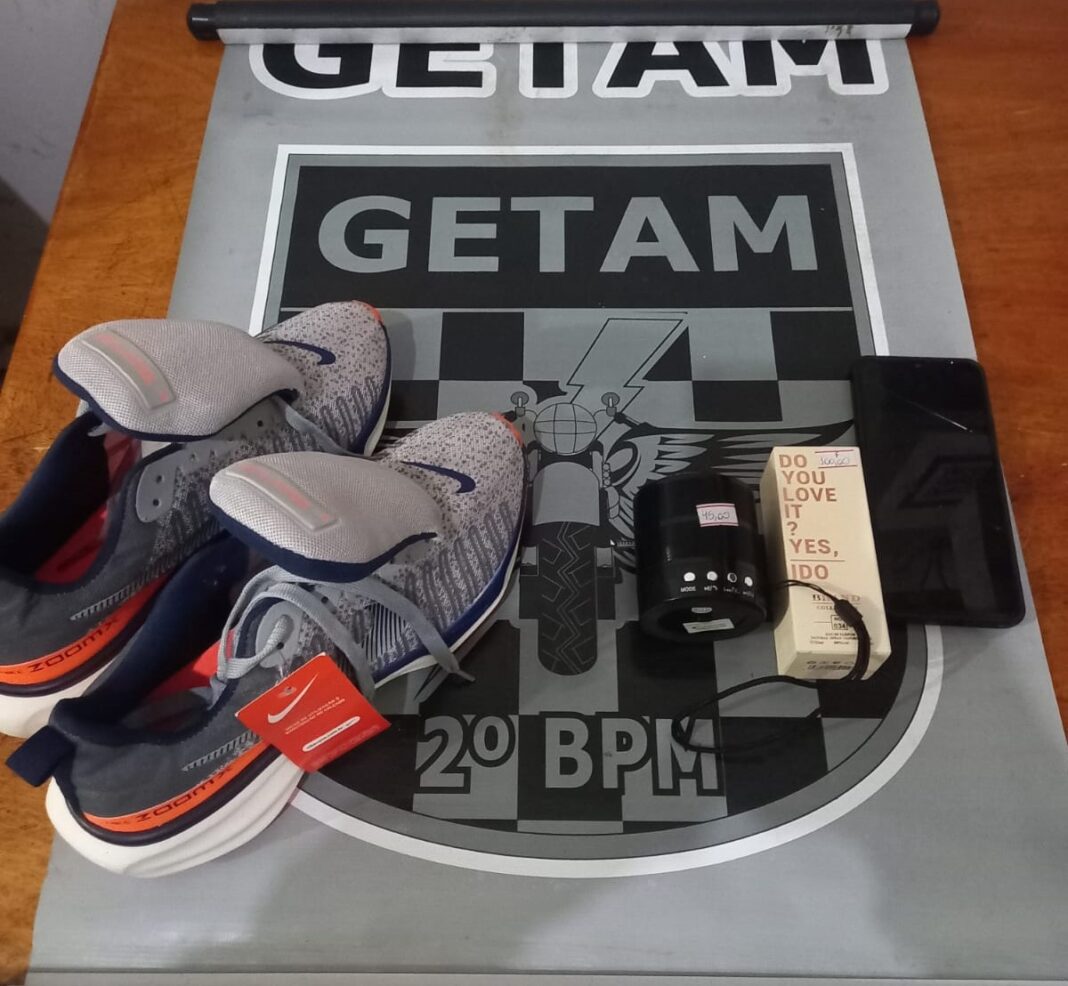 No último sábado (29), por volta das 18h20, uma guarnição do GETAM do 2º BPM foi acionada para atender uma ocorrência de furto em andamento na rua José Hamilcar Congro Bastos, no bairro Vila Nova. Segundo relatos, um homem de 48 anos entrou em uma loja e subtraiu um par de tênis, um perfume e uma caixinha de som.