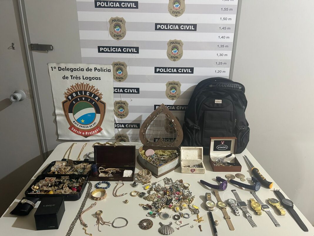 Na tarde desta terça-feira (20/08), policiais civis da 1ª Delegacia de Polícia com o apoio de policiais da 3ª Delegacia de Polícia de Três Lagoas recuperaram joias, semijoias e bijuterias furtadas no último sábado do interior de uma residência localizada no Bairro São Jorge, após o suspeito pular o muro da casa para ingressar no local.