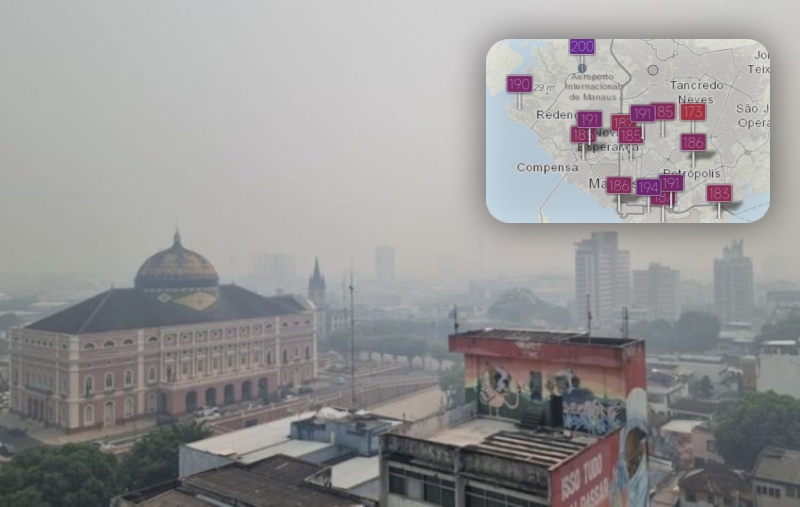 De acordo com o site IQAir, que monitora a qualidade do ar globalmente, diversos bairros de Manaus estão com a qualidade do ar classificada como “muito insalubre”.