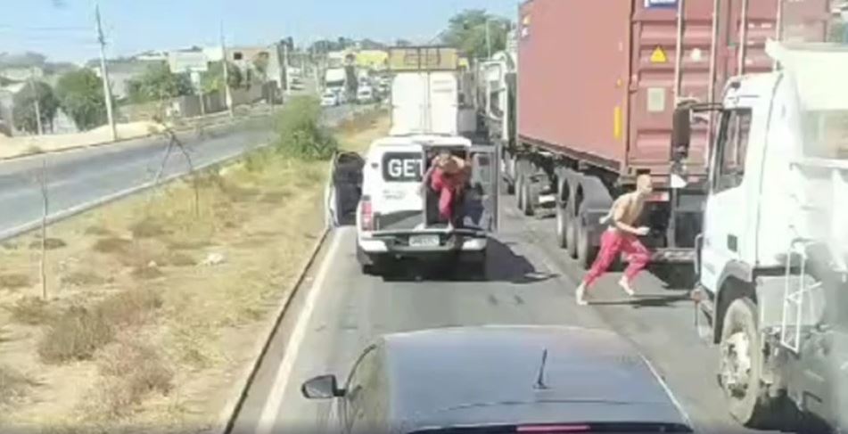 A fuga foi registrada por um caminhoneiro que passava pela rodovia. No vídeo, é possível ver dois homens pulando da parte traseira da viatura e correndo entre os carros. Em seguida, vários policiais saem do veículo e começam a persegui-los.