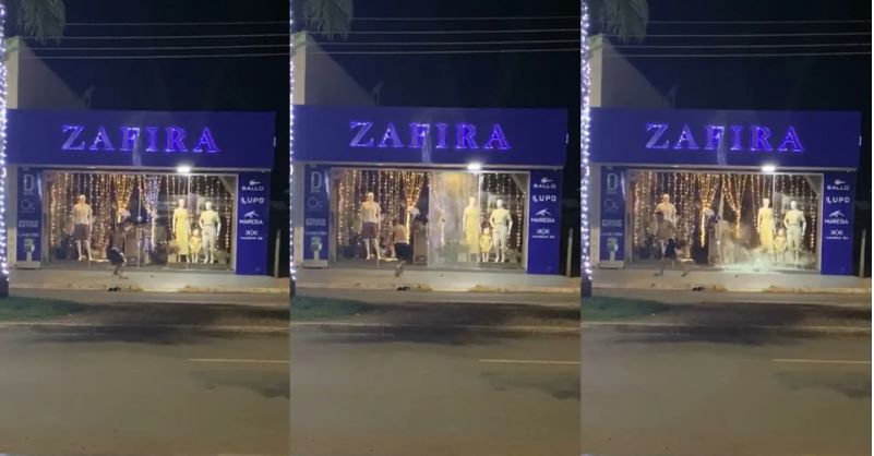 Nas imagens divulgadas pelo site Chapadense News, o homem, sem camiseta, é visto arremessando uma pedra contra a vitrine. Na primeira tentativa, o vidro resiste ao impacto. Ele então recolhe a pedra e, ao lançá-la novamente, consegue destruir a estrutura.