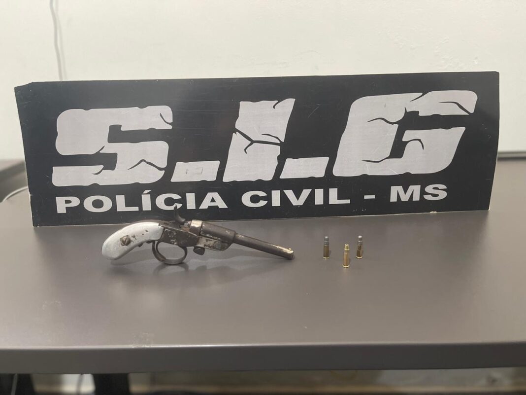No decorrer da ação, os investigadores apreenderam uma arma de fogo do tipo garrucha, contendo uma munição calibre .22 no cano, além de outras duas munições do mesmo calibre encontradas nas proximidades.