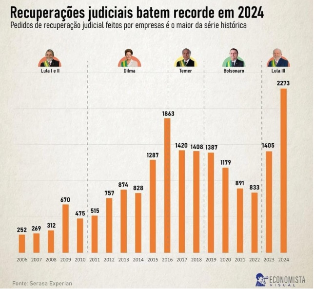 Com o governo Lula, o Serasa registrou em 2024 o maior número de pedidos de recuperação judicial desde o início da série histórica, em 2005. Ao todo, foram contabilizados 2.273 no ano passado, um aumento de 61,8% ante os 1.405 pedidos em 2023.