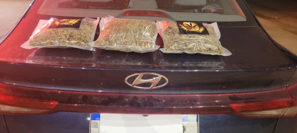 Após conter o passageiro, os policiais realizaram vistoria no veículo e localizaram três pacotes da droga skunk, totalizando aproximadamente 1,5 kg. O homem informou ter adquirido o entorpecente em Campo Grande.