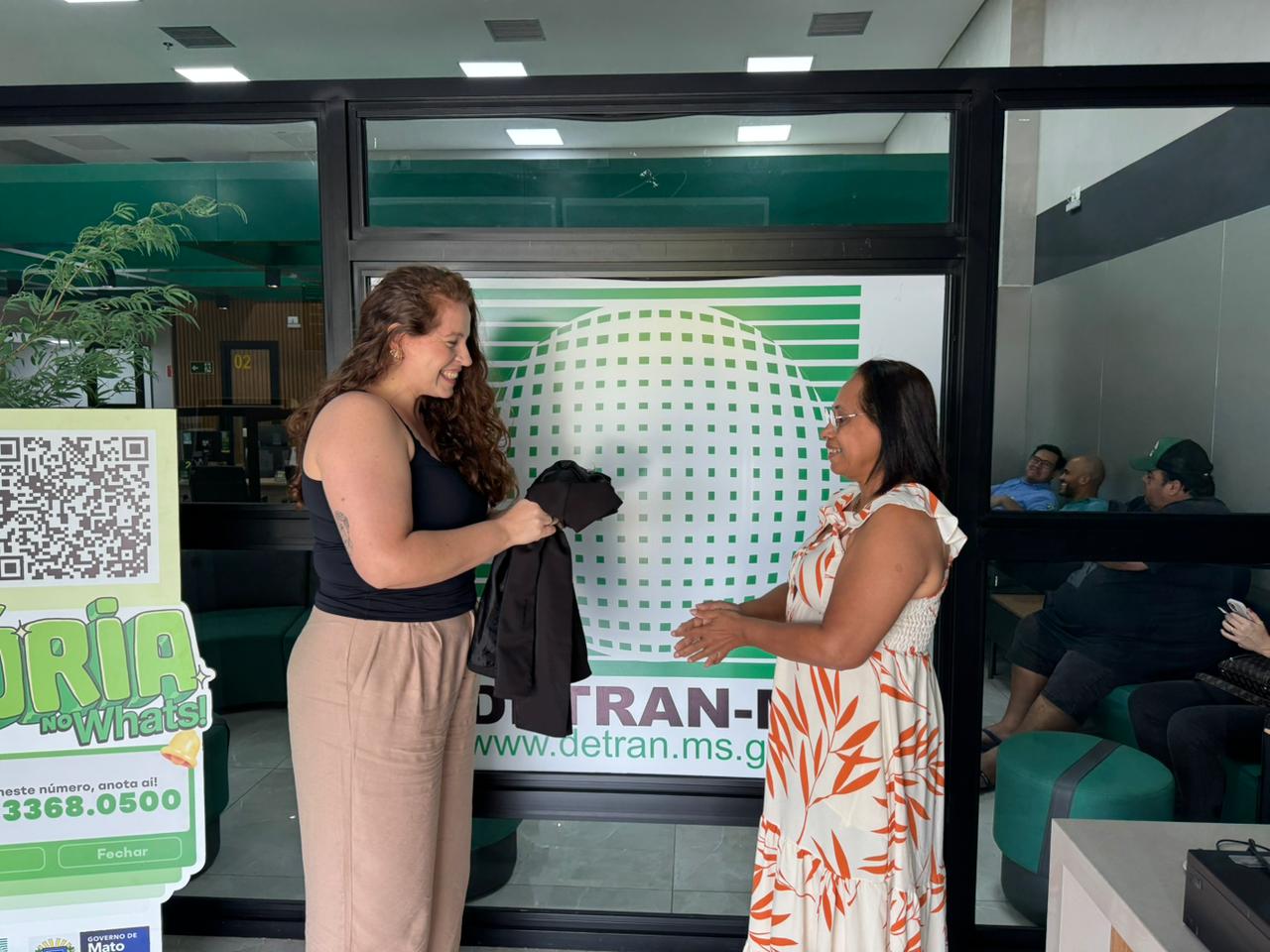 Na ultima quarta-feira (8), Gisele Michaloski Bezerra de Araújo compareceu à Agência do Shopping Campo Grande para renovar a CNH. Ao perceber que sua blusa era regata e deixava os ombros descobertos, foi surpreendida pela gentileza da servidora, que prontamente lhe ofereceu o blazer preto para o registro.