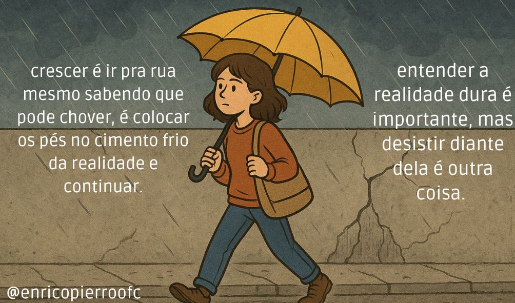 Mas crescer também é isso: continuar. Continuar acreditando naquilo que sobreviveu. Continuar se dispondo mesmo após se decepcionar. Continuar lendo, criando, amando, mesmo quando o livro tem páginas riscadas, quando o quadro está trincado, quando o outro já provou que não quer ver. Crescer é ir para a rua mesmo sabendo que pode chover, é colocar os pés no cimento frio da realidade e continuar.