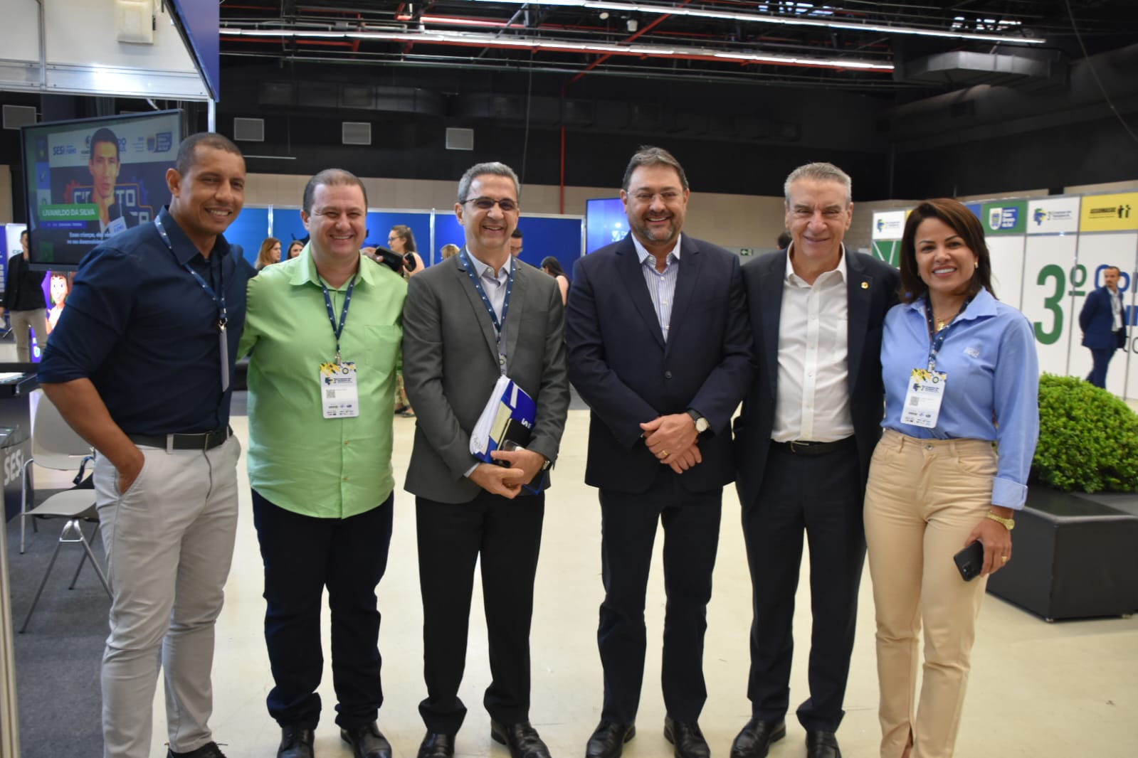 A Fiems conta com um estande onde apresenta soluções do Sesi e do Senai para atender os municípios, como o programa de ESG voltado ao setor público e o programa de geração de energia fotovoltaica.