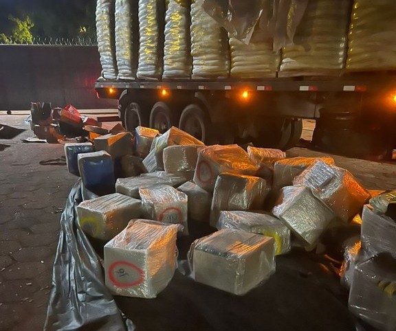 A ação ocorreu em um barracão utilizado como empresa, onde os policiais flagraram o momento em que a droga era inserida no meio de uma carga de fertilizantes transportada por um caminhão. Quando o veículo deixava o local, a equipe realizou a abordagem e prendeu dois suspeitos.
