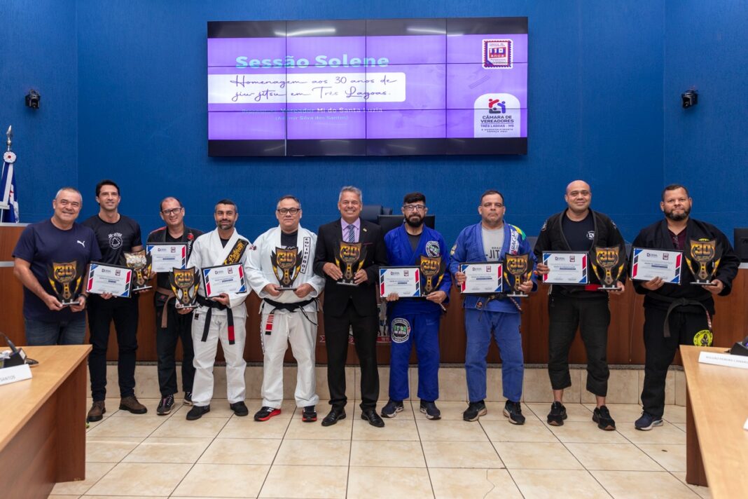 A casa de leis ficou bem protegida na noite desta sexta-feira (28) com o número de atletas de jiu-jitsu no plenário para celebrar os 30 anos da modalidade em Três Lagoas. A solenidade foi uma propositura do vereador Mi do Santa Luzia. O secretário de Esporte, Juventude e Lazer (Sejuvel), Walter Dias – “Hulk”, prestigiou o evento na mesa de honras, representando o executivo.