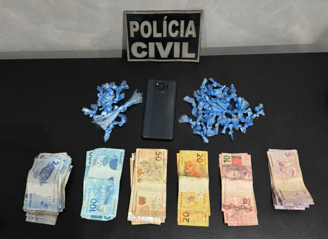No interior do imóvel, foram apreendidas 11 trouxinhas de cocaína, pesando 4,64 gramas, e 44 trouxinhas de crack, pesando 17,1 gramas. Com o suspeito também foram encontrados R$ 1.061,00 em diversas notas, característicos da atividade de microtráfico, além de um aparelho celular.