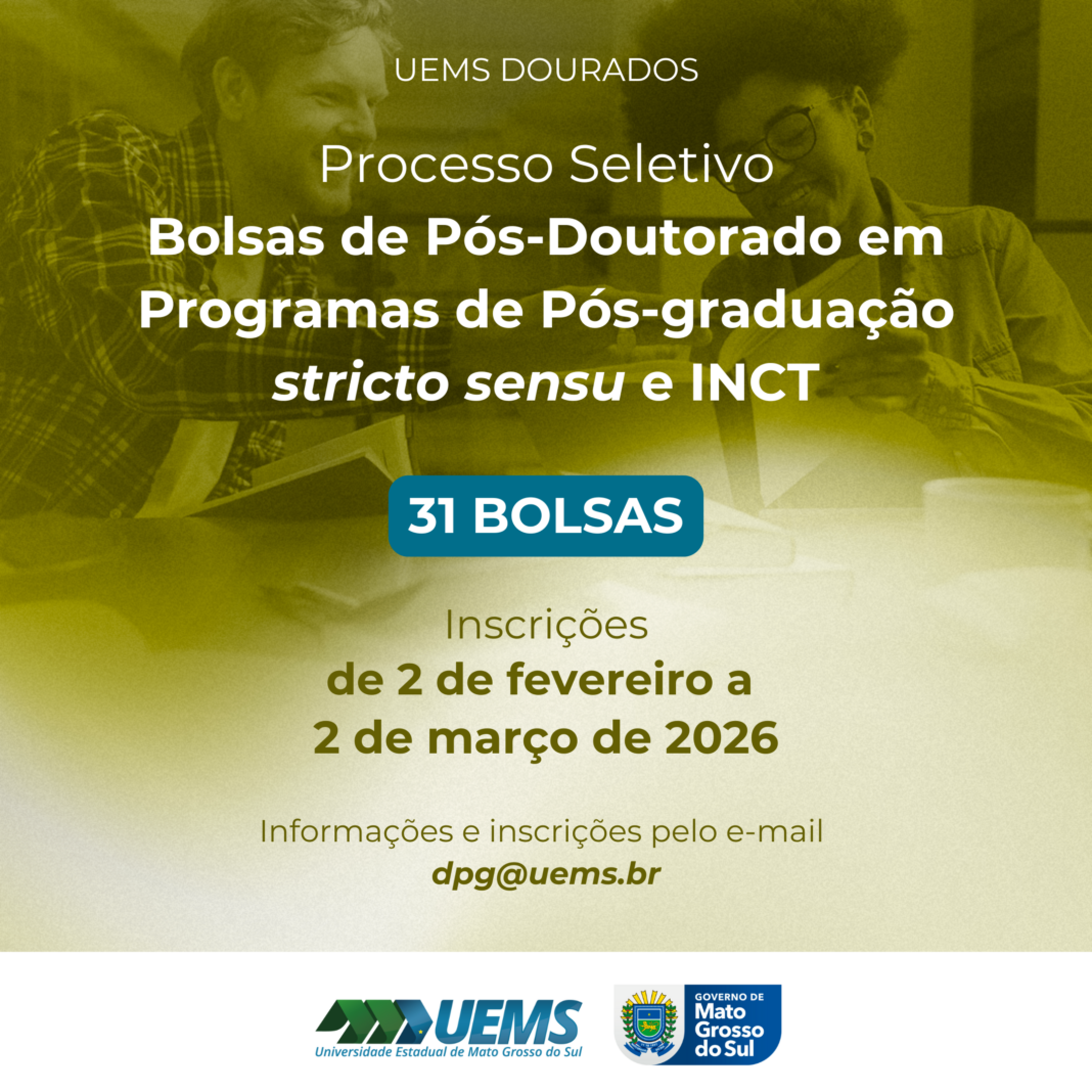 A Universidade Estadual de Mato Grosso do Sul (UEMS), por meio da Pró-Reitoria de Pesquisa, Pós-Graduação e Inovação (PROPPI), lançou a Chamada nº 001/2025 para a seleção de pesquisadores interessados em bolsas de Pós-Doutorado vinculadas aos Programas de Pós-Graduação stricto sensu e aos Institutos Nacionais de Ciência e Tecnologia (INCT) da instituição.