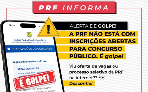 A Polícia Rodoviária Federal (PRF) alerta que circula um falso site anunciando processo seletivo para ingresso na instituição. Na falsa publicação, são listados cargos que não integram a carreira PRF, como delegado, escrivão e agente policial. A PRF informa que o ingresso na carreira se dá exclusivamente por meio de concurso público, realizado por empresa especializada contratada estritamente para essa finalidade.
