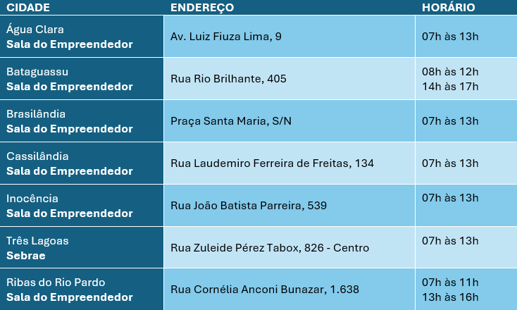 O Cidade Empreendedora é um programa executado pelo Sebrae/MS, em parceria com o Governo do Estado, por meio da Secretaria de Estado de Meio Ambiente, Desenvolvimento, Ciência, Tecnologia e Inovação (Semadesc), e com as administrações municipais de 36 cidades. Recebem o mutirão os municípios de Água Clara, Bataguassu, Brasilândia, Cassilândia, Inocência, Ribas do Rio Pardo e Três Lagoas, alcançando 14 mil MEIs ativos nessas localidades.