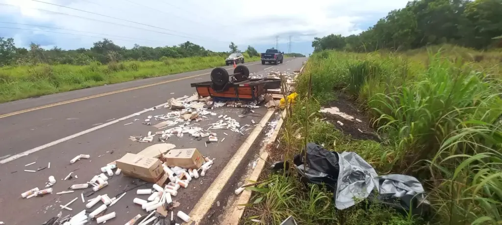 De acordo com informações da PRF (Polícia Rodoviária Federal), a colisão envolveu um Citroën e uma caminhonete Ranger, que ficaram totalmente destruídos. A Ranger, que transportava caixas de produtos em uma carroceria acoplada, capotou após o impacto, espalhando a carga pela pista.