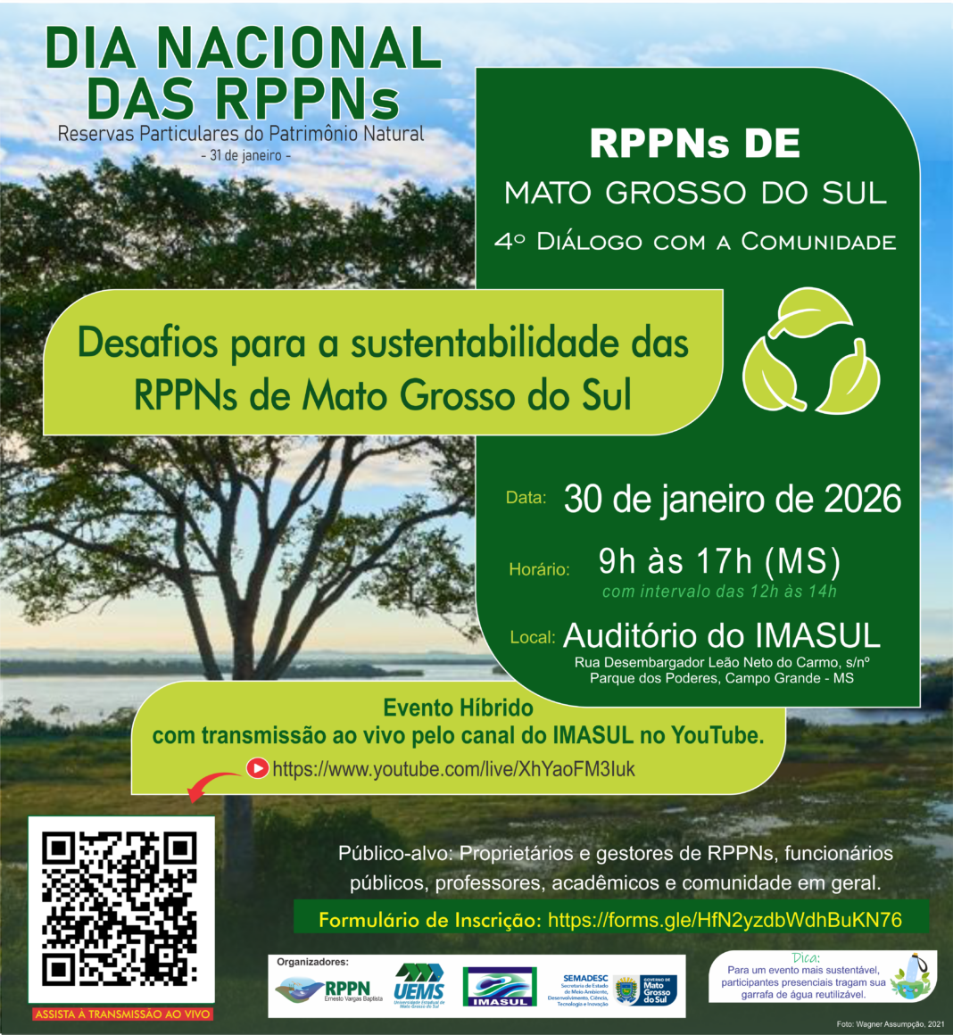 A Universidade Estadual de Mato Grosso do Sul (UEMS) integra a organização da 4ª edição do evento “Diálogo com a Comunidade: Desafios para a Sustentabilidade das RPPNs de Mato Grosso do Sul”, que será realizado no dia 30 de janeiro de 2026, em Campo Grande. As inscrições estão abertas e podem ser feitas via formulário online, por meio do link: https://forms.gle/HfN2yzdbWdhBuKN76.