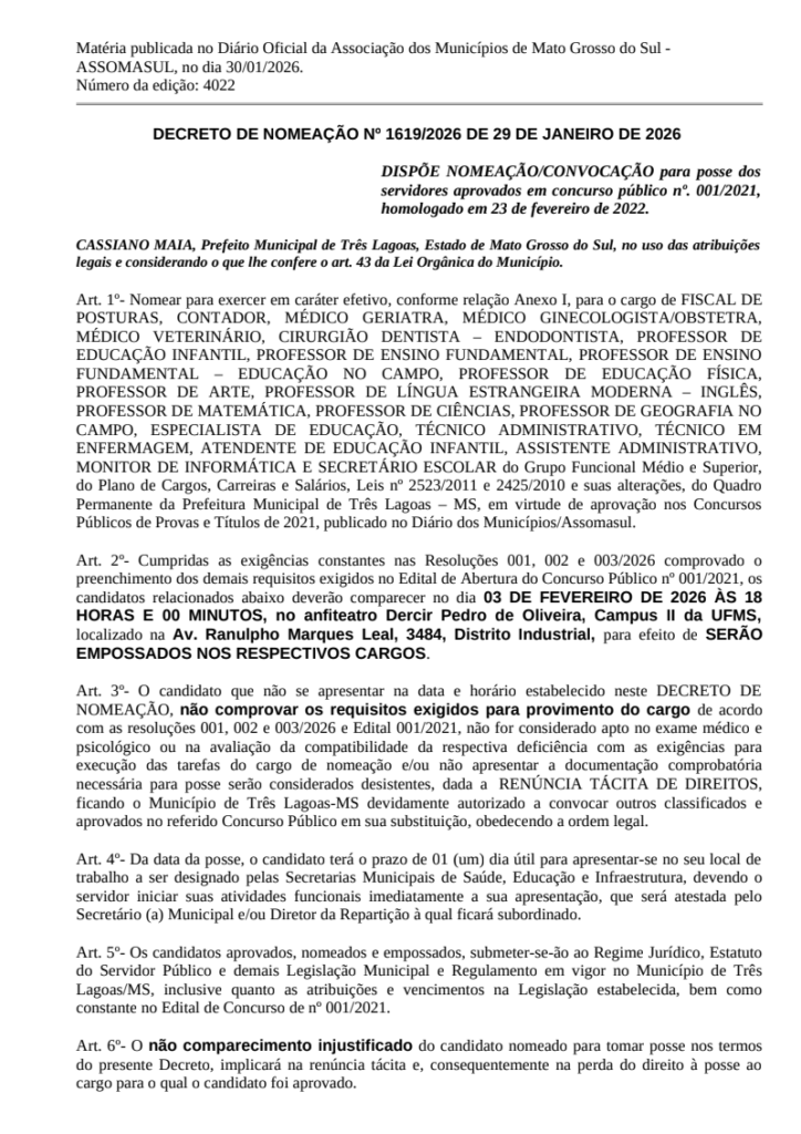 A Prefeitura Municipal, por meio da Secretaria Municipal de Gestão de Pessoas (SEGP), convoca para posse os servidores aprovados no concurso público nº. 001/2021, homologado em 23 de fevereiro de 2022. Os candidatos aprovados deverão comparecer no dia 03 de fevereiro de 2026, às 18h, no anfiteatro Dercir Pedro de Oliveira, Campus II da UFMS, localizado na Av. Ranulpho Marques Leal, 3484, Distrito Industrial, para serem empossados nos respectivos cargos.