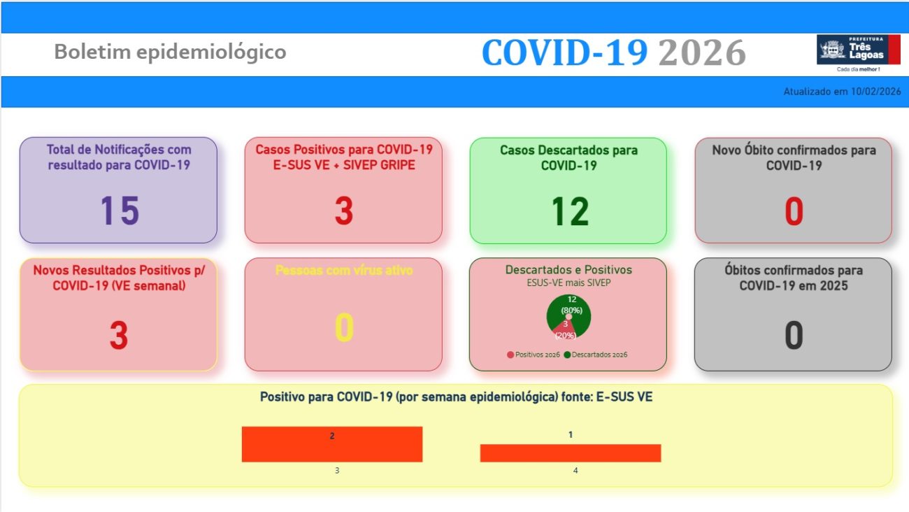 Boletim COVID-19 em Três Lagoas – 10 de fevereiro de 2026 Por Redação 09:07 - 11/02/2026 0 22 Share FacebookTwitterPinterestWhatsApp Foto: Divulgação/Prefeitura de Três Lagoas A Prefeitura de Três Lagoas, por meio do setor de Vigilância Epidemiológica da Secretaria Municipal de Saúde (SMS), divulga o Boletim Covid-19. Share FacebookTwitterPinterestWhatsApp Leia também CARNATRÊS 2026 – Fique atento aos prazos e saiba como participar do Concurso de Fantasia Infantil 10:39 - 11/02/2026 Com apoio de helicóptero, DOF apreende quase duas toneladas de maconha em caminhonete furtada 10:33 - 11/02/2026 Exportações de MS revelam nova geografia logística com avanço do Porto de Paranaguá 10:18 - 11/02/2026 Polícia Militar prende indivíduo por tráfico de drogas em Paranaíba 10:03 - 11/02/2026 Polícia Militar prende autores de furto, receptação e dano ao patrimônio público em Paranaíba 10:00 - 11/02/2026 PROEC/UEMS publica edital do Programa Institucional de Bolsas de Extensão com mais de 250 oportunidades 09:48 - 11/02/2026 Sesi e Senai levam entretenimento e educação para participantes do Delas Day 09:46 - 11/02/2026 Ataque a tiros em escola no Canadá deixa 10 mortos 09:38 - 11/02/2026 Governo federal reajusta repasse da merenda escolar em 14,3% para 2026 09:31 - 11/02/2026 Últimas Três Lagoas CARNATRÊS 2026 – Fique atento aos prazos e saiba como participar do Concurso de Fantasia Infantil 10:39 - 11/02/2026 Polícia Com apoio de helicóptero, DOF apreende quase duas toneladas de maconha em caminhonete furtada 10:33 - 11/02/2026 Logistica Exportações de MS revelam nova geografia logística com avanço do Porto de Paranaguá 10:18 - 11/02/2026 Polícia Polícia Militar prende indivíduo por tráfico de drogas em Paranaíba 10:03 - 11/02/2026 Paranaíba Polícia Militar prende autores de furto, receptação e dano ao patrimônio público em Paranaíba 10:00 - 11/02/2026