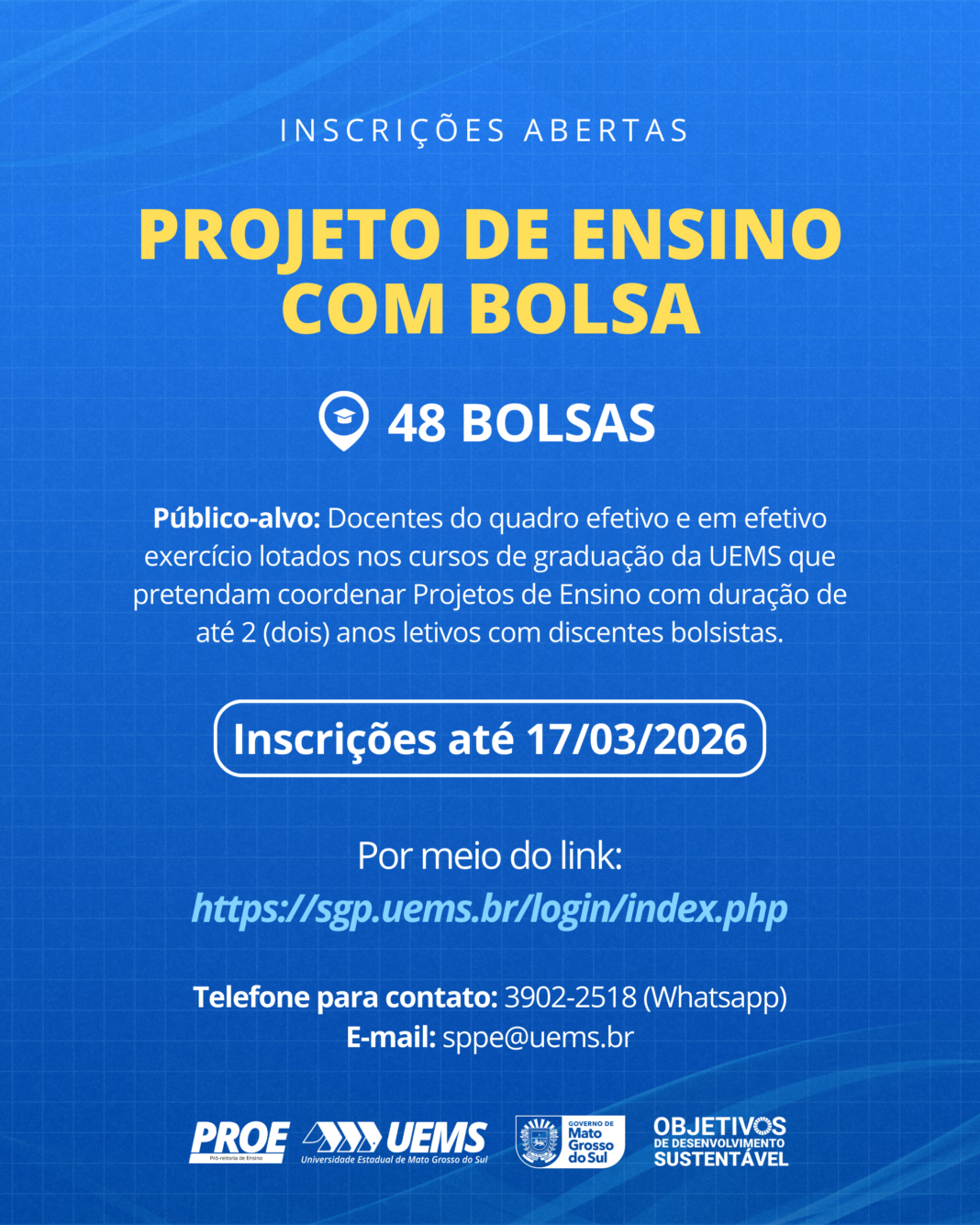 A Pró-Reitoria de Ensino (PROE) da Universidade Estadual de Mato Grosso do Sul (UEMS) publicou o Edital nº 016/2026 – PE/DEPPE/PROE/UEMS, que regulamenta a seleção de propostas para o Programa Projeto de Ensino e a concessão de bolsas a acadêmicos da graduação.