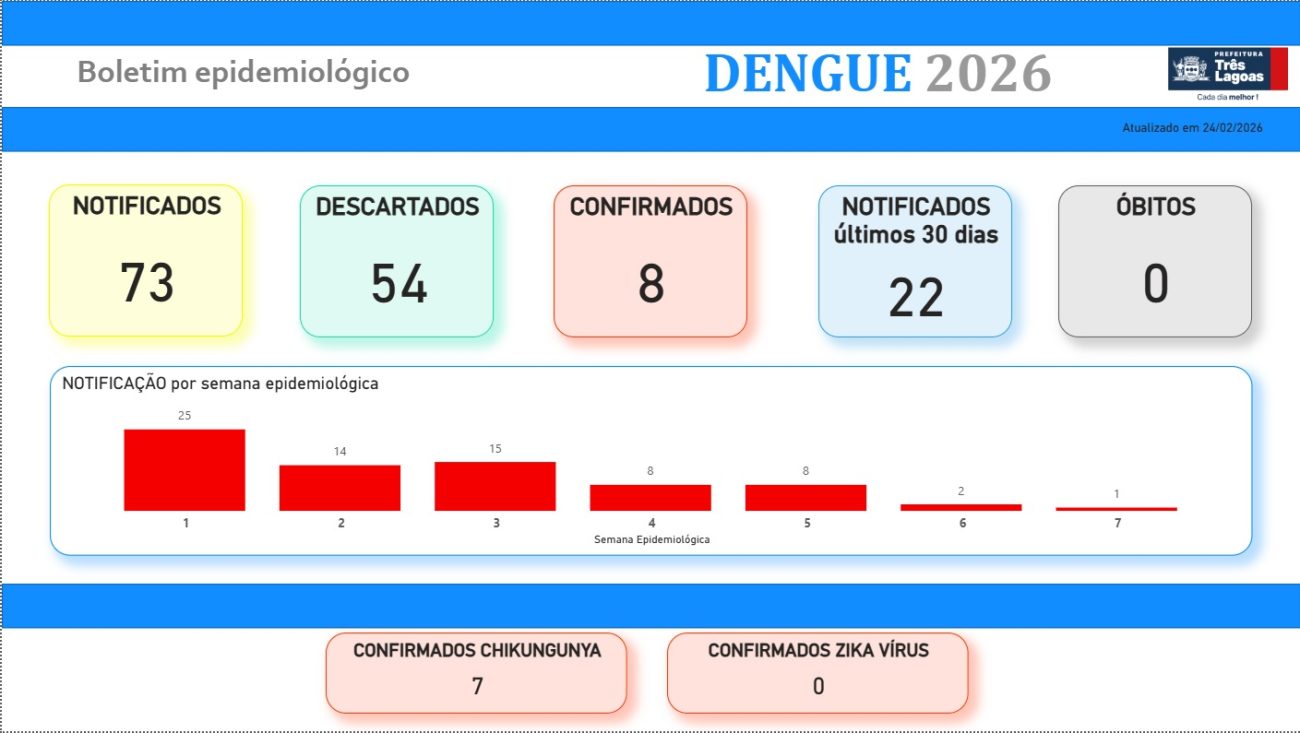 Boletim Dengue e Leishmaniose em Três Lagoas – 25 de fevereiro de 2026 Por Redação 14:00 - 25/02/2026 0 19 Share FacebookTwitterPinterestWhatsApp Foto: Divulgação/Prefeitura de Três Lagoas A Prefeitura de Três Lagoas, por meio do setor de Vigilância Epidemiológica da Secretaria Municipal de Saúde (SMS), divulga o Boletim Dengue. Share FacebookTwitterPinterestWhatsApp Leia também Fiems apresenta a embaixador da Hungria potencialidades do setor industrial de MS 15:32 - 25/02/2026 PRF encerra Operação Rodovida com mais de 41 mil infrações em MS 14:22 - 25/02/2026 Internacionalização como caminho estratégico para empreendedoras é um dos destaques do Delas Day 14:19 - 25/02/2026 Prefeito se reúne com representantes de ACS’s e ACE’s pela valorização da categoria 14:19 - 25/02/2026 Feirão de Vagas conecta mais de 200 jovens ao mercado de trabalho 14:14 - 25/02/2026 Delas Day 2026: Pollyana Félix e Natalia Beauty compartilham estratégias para empreendedoras se destacarem no mercado 14:12 - 25/02/2026 Boletim COVID-19 em Três Lagoas – 25 de fevereiro de 2026 13:57 - 25/02/2026 Degrau por degrau, uma história de superação e oportunidades 11:19 - 25/02/2026 Polícia Militar realiza prisão de um autor de tráfico de drogas em Três Lagoas 10:41 - 25/02/2026 Últimas Indústria Fiems apresenta a embaixador da Hungria potencialidades do setor industrial de MS 15:32 - 25/02/2026 Polícia PRF encerra Operação Rodovida com mais de 41 mil infrações em MS 14:22 - 25/02/2026 Geral Internacionalização como caminho estratégico para empreendedoras é um dos destaques do Delas Day 14:19 - 25/02/2026 Três Lagoas Prefeito se reúne com representantes de ACS’s e ACE’s pela valorização da categoria 14:19 - 25/02/2026 Três Lagoas Feirão de Vagas conecta mais de 200 jovens ao mercado de trabalho 14:14 - 25/02/2026