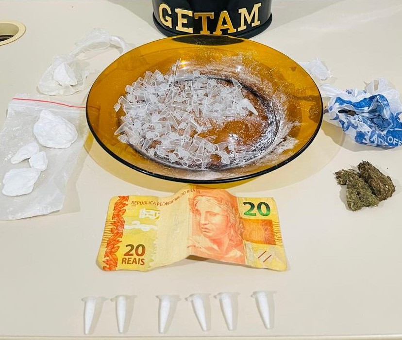 Durante a “Operação Força Total”, uma equipe do GETAM do 2º BPM realizava rondas no bairro Jardim das Violetas quando abordou. No decorrer da busca pessoal do masculino de 36 anos, foram localizados 6 “pinos” de cocaína o qual o mesmo veio a relatar ser usuário, informando ter adquirido o entorpecente da mulher.