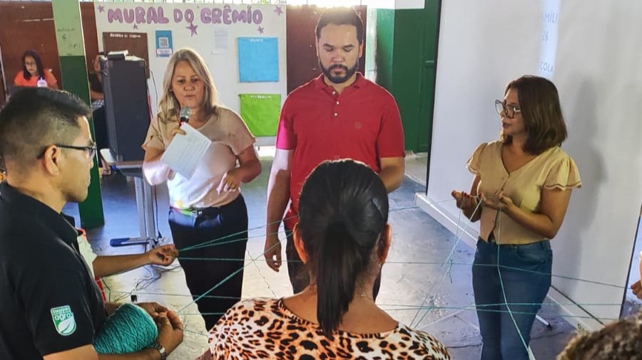 A programação teve início com uma acolhida conduzida por estagiários de Psicologia. Por meio da atividade de uma ‘teia’ (com barbante), os participantes construíram simbolicamente uma rede de conexões, representando a interdependência entre família e escola no desenvolvimento educacional.