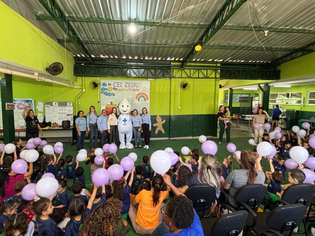 A programação no CEI Zedu incluiu atividade lúdica com balões, brincadeiras e a participação do personagem Zé Gotinha, além de uma conversa interativa com crianças e educadores sobre a importância da vacinação e a identificação de casos suspeitos de sarampo.