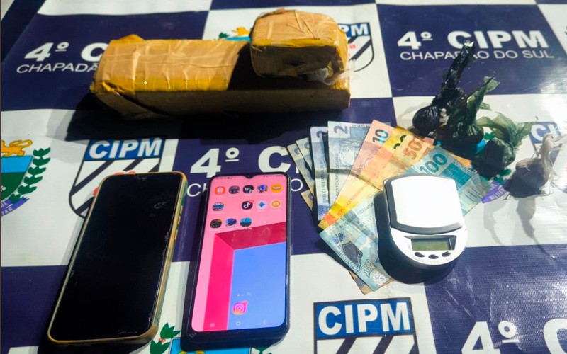 Durante a ação, os policiais localizaram 765 gramas de maconha, divididas em cinco porções e um tablete da droga. Além do entorpecente, a Polícia Militar apreendeu ainda uma balança de precisão, dinheiro em espécie e dois aparelhos de telefone celular.