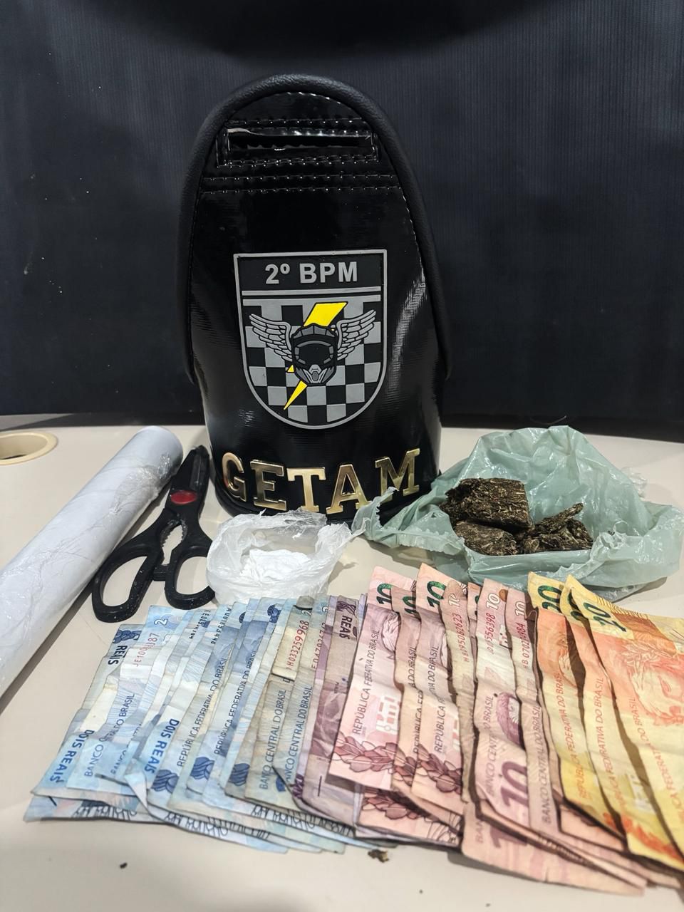 Durante as buscas no imóvel, os policiais encontraram 19,60 gramas de cocaína sobre a mesa da cozinha, além de materiais utilizados para embalar e comercializar a droga. Também foram apreendidos 63,90 gramas de maconha.