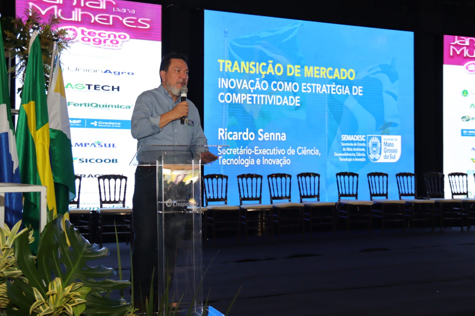 A programação da tarde desta terça-feira (17), na 28ª TecnoAgro, em Chapadão do Sul, foi marcada pela palestra “Transições de Mercado”, ministrada pelo secretário-executivo de Ciência, Tecnologia e Inovação da Semadesc, Ricardo Senna. A apresentação estabeleceu a conexão entre inovação, dinâmica econômica e as novas oportunidades de negócios no agronegócio, preparando o ambiente para a Sessão de Negócios realizada, na sequência.