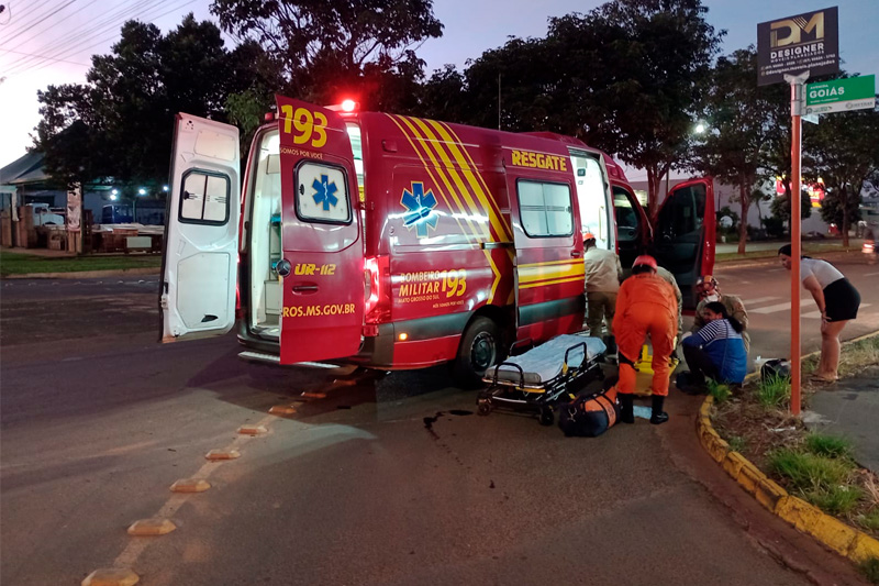 O Corpo de Bombeiros foi acionado para atender o caso, que ocorreu na rotatória da Avenida Goiás, esquina com a Av. Mato Grosso do Sul. No local os bombeiros encontraram a mulher consciente, orientada, porém com um ferimento contuso no rosto, provocado na queda, e provavelmente devido ao uso do capacete aberto, alertaram os Bombeiros.