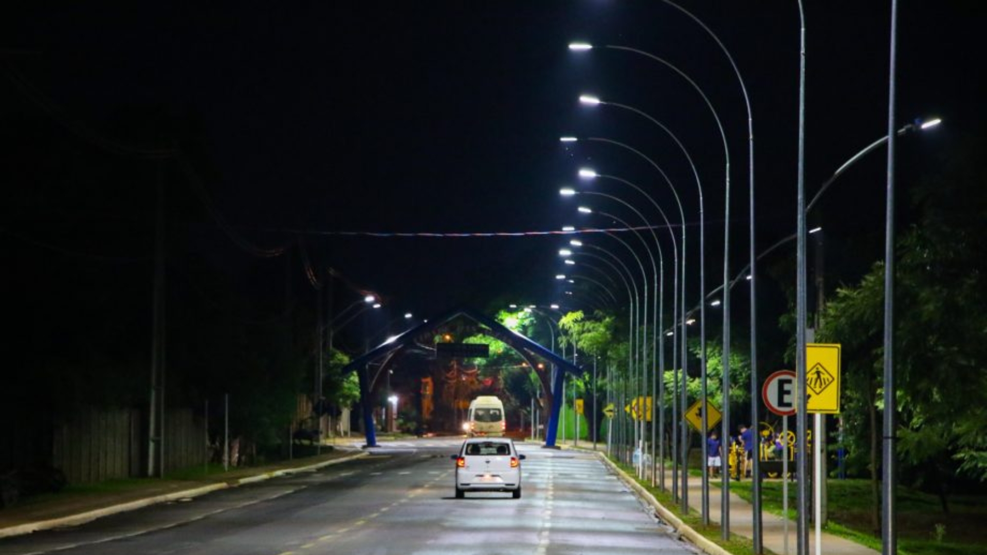A substituição das antigas lâmpadas de vapor de sódio por tecnologia LED melhora a visibilidade noturna, inibindo a ação de criminosos e facilitando o monitoramento e o patrulhamento preventivo da Polícia Militar.