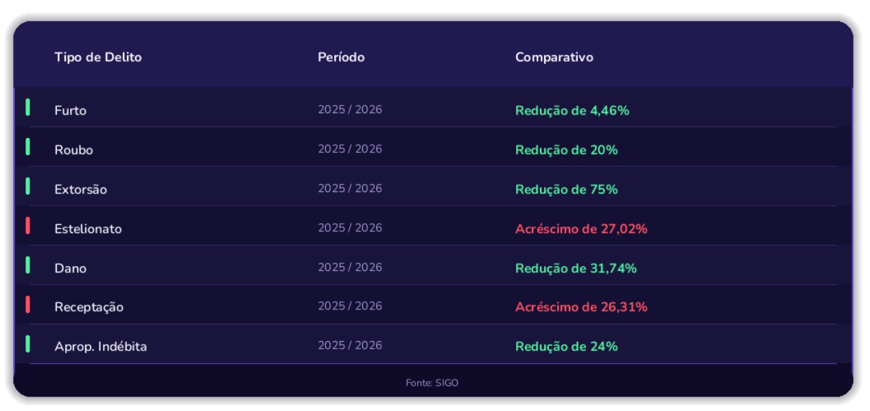 Ao lado da nova iluminação, a polícia afirma que houve uma intensificação nas rondas da cidade. Um dado que chama a atenção no relatório é o aumento de 26,31% nos registros de receptação (que saltaram de 19 em 2025 para 24 em 2026). No entanto, o 2º BPM esclareceu que esse número não deve ser visto como um ponto negativo.