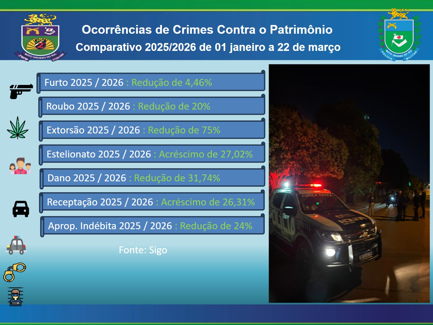 A sensação de segurança para os moradores de Três Lagoas tem ganhado novos contornos em 2026. O Perfil News apurou, segundo dados divulgados pelo Sistema Integrado de Gestão Operacional (Sigo) e pelo 2º Batalhão de Polícia Militar (2º BPM), que o município registrou uma queda significativa de 20% nos casos de roubo e de 4,46% nos furtos entre 1º de janeiro e 22 de março, na comparação entre os anos de 2025 e 2026.