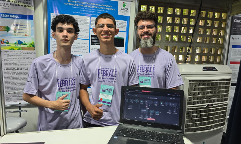 O projeto ‘Apoio Inteligente à Jornada Acadêmica: Automação com IA para estudantes do Proeja’, desenvolvido no Campus Jardim pelos estudantes Felipe Gonçalves da Silva e Lucas Damázio, e orientado pelo professor de Informática/Redes de Computadores, Leandro Steffen, recebeu um prêmio: