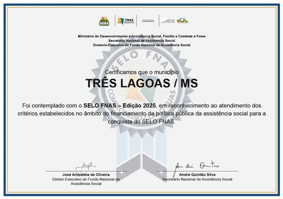 A Prefeitura de Três Lagoas foi reconhecida com o Selo FNAS de Excelência, certificação concedida pelo Fundo Nacional de Assistência Social a estados e municípios que se destacam na gestão orçamentária, financeira e contábil dos recursos do Sistema Único de Assistência Social (SUAS).