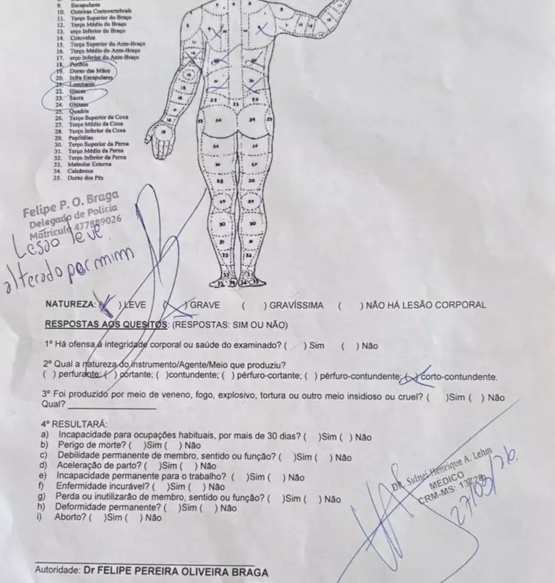 Por isso, chegou em casa com hematomas pelas costas e braços. O garoto passou por exame de corpo de delito que constatou lesões graves, conforme laudo assinado pelo médico Sidinei Henrique Lehm, mas em solo policial, o delegado Felipe Braga decidiu tratar o caso como de natureza leve.