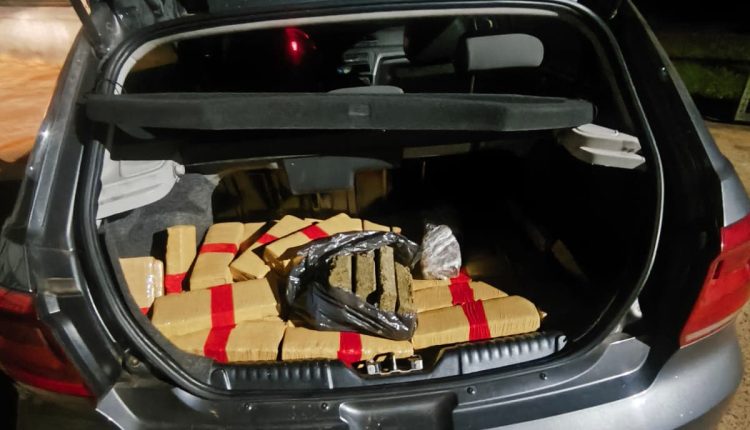 No interior do automóvel, os policiais encontraram 150 tabletes de maconha, totalizando aproximadamente 100,42 quilos da droga. O material estava embalado com fita crepe de cor marrom e apresentava marcação com fita isolante vermelha.