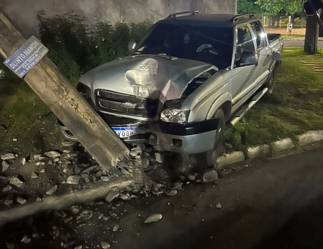 Já na madrugada de domingo (26), uma ocorrência ainda mais grave foi registrada na região da Lagoa Maior. Uma caminhonete colidiu violentamente contra um poste de concreto na Avenida Capitão Olinto Mancini, no cruzamento com a Rua Aldair Rosa de Oliveira.