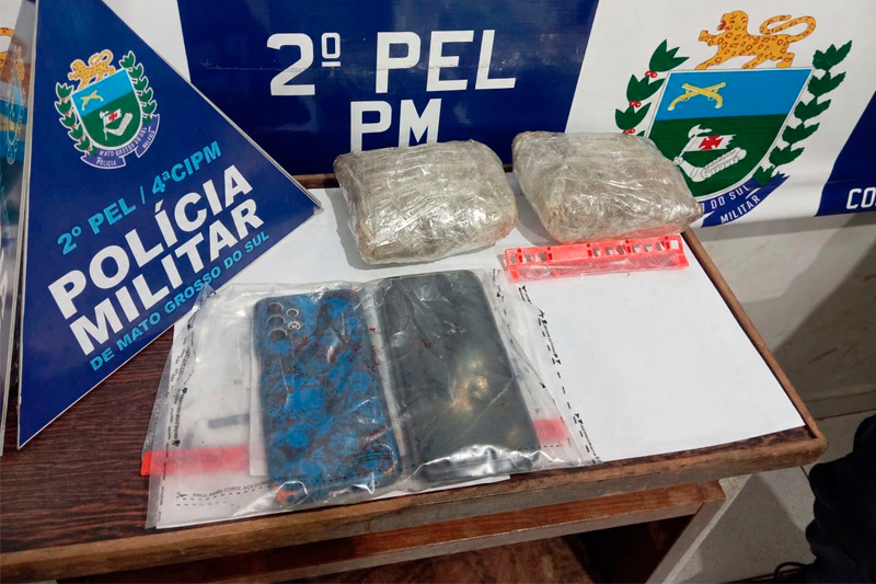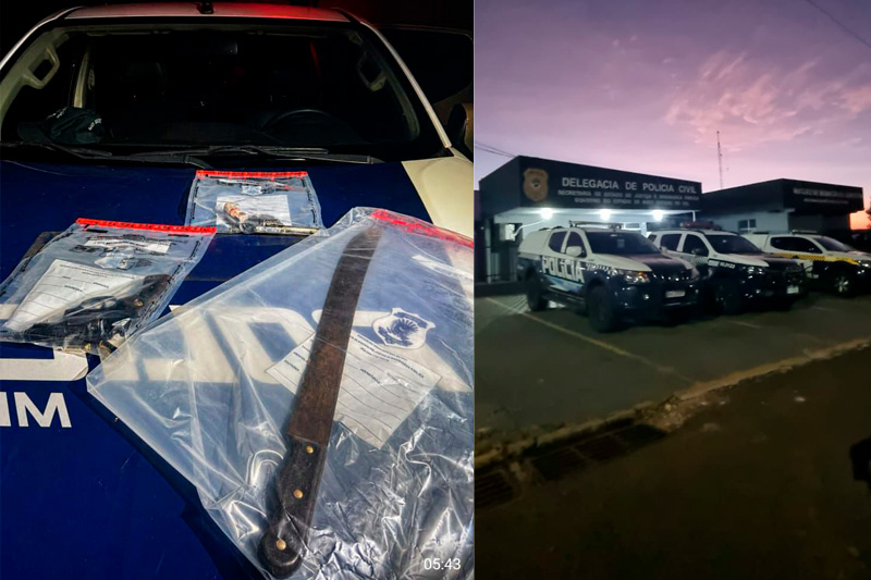 Na ocorrência, foram apreendidos dois revólveres, um facão, porções de droga do tipo skunk, aparelhos celulares.
