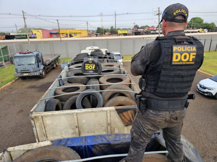 Policiais militares do DOF (Departamento de Operações de Fronteira) apreenderam na madrugada deste domingo (14) cerca de 36 pneus para caminhão e oito pneus para veículo de passeio, todos novos e sem a documentação legal para circulação no Brasil.