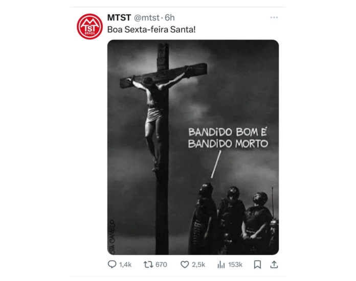Uma charge que retratou, na sexta-feira (29), Jesus Cristo crucificado junto à frase “bandido bom é bandido morto” dita por soldados romanos foi publicada pelo Movimento dos Trabalhadores Sem Teto (MTST), em pleno feriado da Sexta-feira da Paixão de Cristo. E gerou uma enxurrada de críticas ao deputado federal Guilherme Boulos (PSOL-SP), que liderou o movimento por 20 anos.