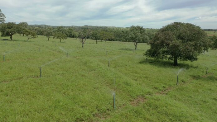 Área de pastagem próxima à fábrica da Marajoara em Hidrolândia beneficiada com projeto de fertirrigação da indústria de Laticínios. (Foto: Divulgação/Assessoria)