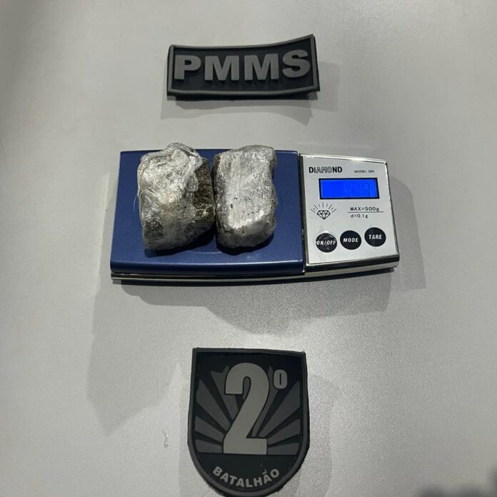Continuando a revista, os policiais também encontraram mais um “tablete” de maconha pesando 16,9 gramas, escondido dentro do tênis do condutor, totalizando 34,9 gramas da droga.